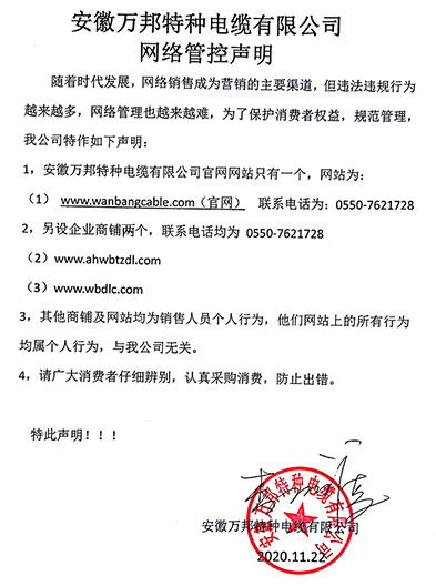 鄭重聲明:安徽萬邦特種電纜有限公司官方網站為:www_wanbangcable_com.zzdfhk.com,除此之外無任何子網站或合作網站,其余均為假冒偽劣。電話:0550-7621728 13485756353 地 址:安徽省天長市滁州高新技術產業開發區經四路29號